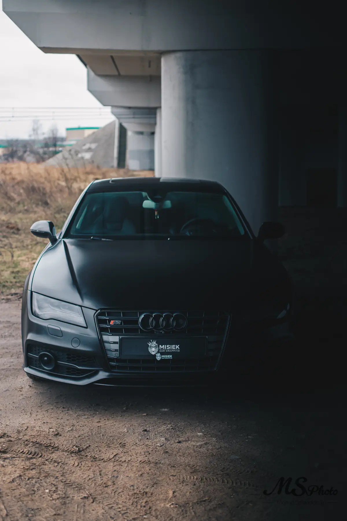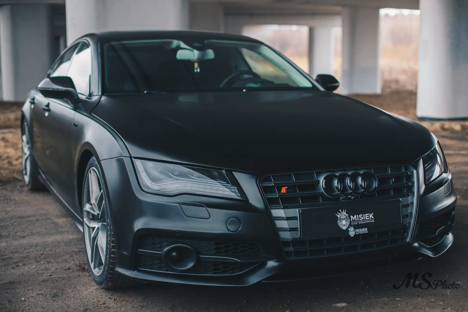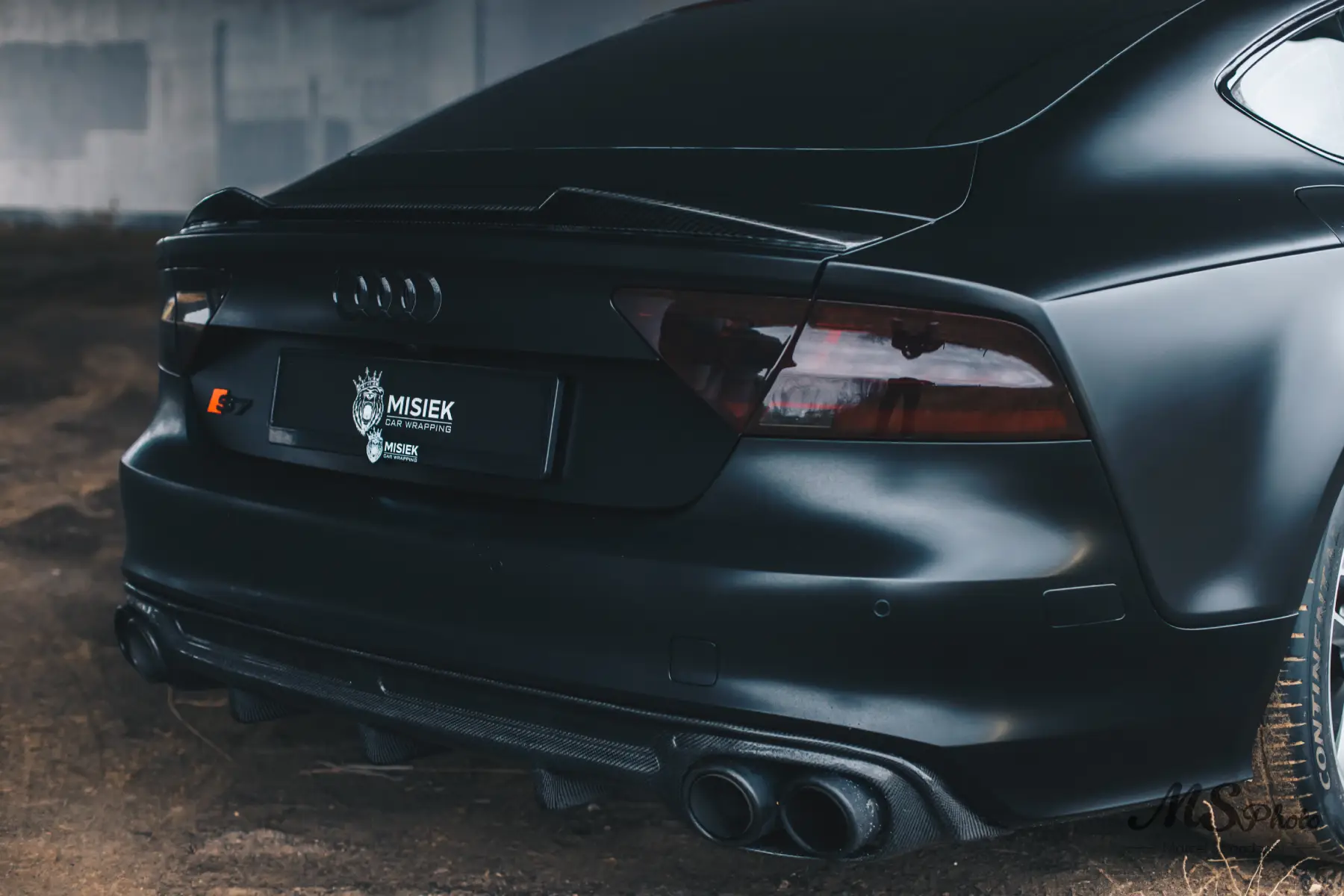 Przyjęliśmy wyjątkowy wybór folii 3M Satin Black 2080, aby nadać samochodowi niepowtarzalny wygląd. Ten matowy odcień doskonale podkreśla charakter sportowy i elegancję Audi S7.